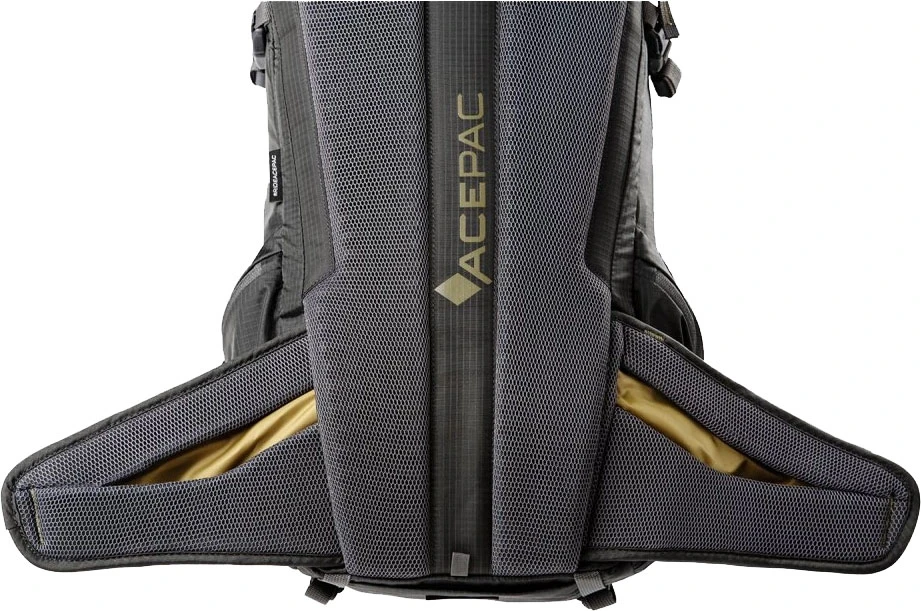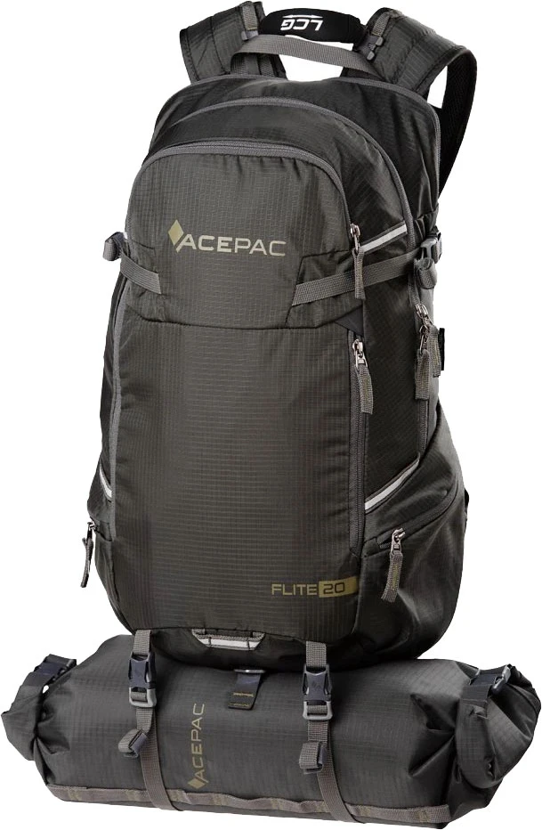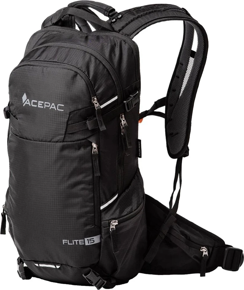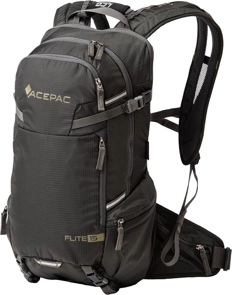 Acepac Flite 15 MKIII: všestranný batoh o objemu 15 litrů s odnímatelným bederním pásem který lze nosit jako ledvinku. Má E3D odvětraný zádový systém, nastavitelný hrudní popruh a dělené ramenní popruhy, bederní pás.