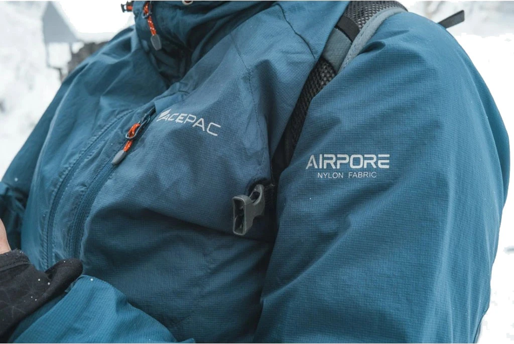 Bunda je vyrobená z ultralehké nylonové tkaniny Nylon Airpore. Ta se vyznačuje velkou odolností proti větru, vysokou prodyšností (tyto dvě vlastnosti zajišťují ultrajemná 15D vlákna) a částečnou voděodpudivostí. Té napomáhá i C6 DWR úprava, která umožní použít oblečení bez problémů i v mírném kratším dešti.