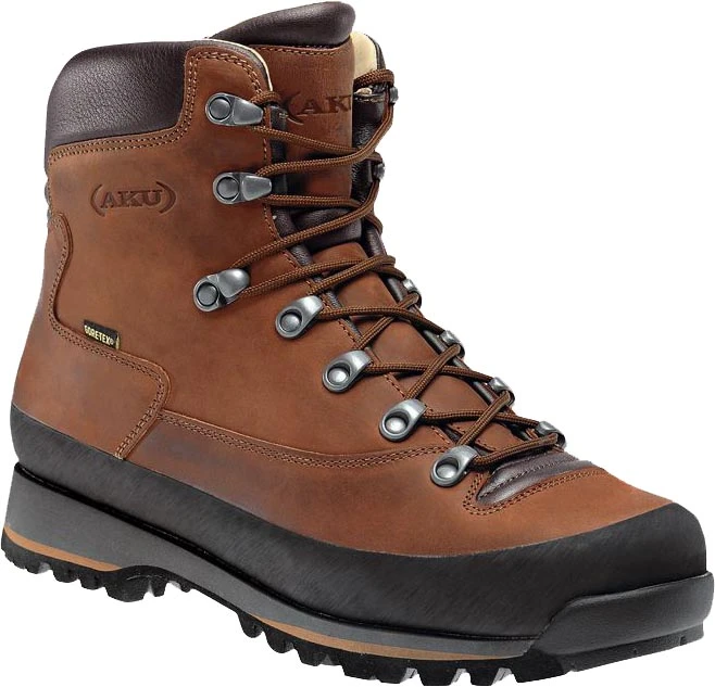 Vysoké kožené boty AKU Conero NBK GTX – celokožené pohorky jsou vyrobeny s minimem švů, které snižují riziko reklamace i promočení. Špičku kryje guma proti okopání. Je u nich použita goretexová membrána pro zajištění suchých noho v zimě i v dešti. Podrážky jsou vyrobeny z tvrdého Vibramu, který je velmi odolný k sešlapání. Pokud by se to přesto podařilo, podrážka je vyrobena tak, aby je bylo možné podrazit. Hodí se do náročného terénu.
