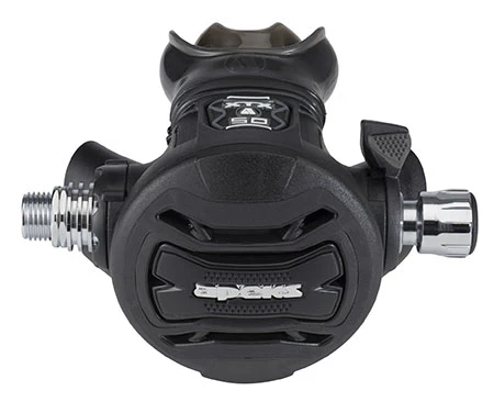 Apeks 2. stupeň XTX50 – má kovový tepelný výměník, hodí se do studené vody, kde vám zabrání zamrznutí tohoto druhého stupně. Jde u něj nastavit pomocí šroubu nádechový odpor (oproti XTX40). Nastavíte si to dle svých preferencí prsty i pod vodou. Má ovládání venturiho efektu.