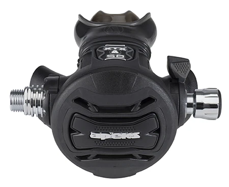 2. stupeň Apeks XTX50 je v setu samozřejmě dvakrát. Je určený do studené vody, má tepelný výměník proti zamrznutí. Jde u nich nastavit nádechový odpor pomocí šroubu (oproti XTX40). Nastavíte si to dle svých preferencí prsty i pod vodou.