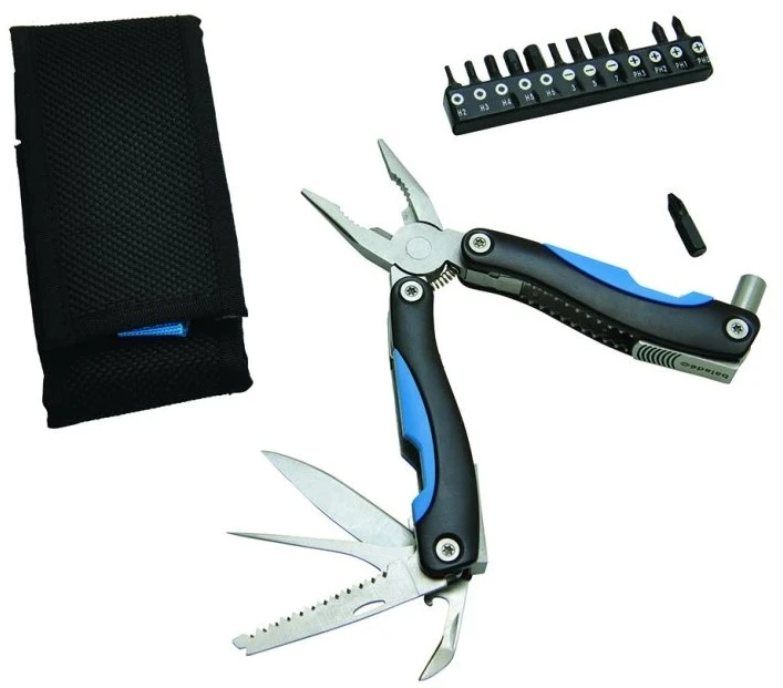 Funkce: univerzální kleště, stříhací kleště, nůž, otvírák lahví, děrovací trn, pilka, vývrtka, zaváděcí trn pro nitě, 3 velikosti imbusového klíče, 3 ploché šroubováky, 3 křížové šroubováky