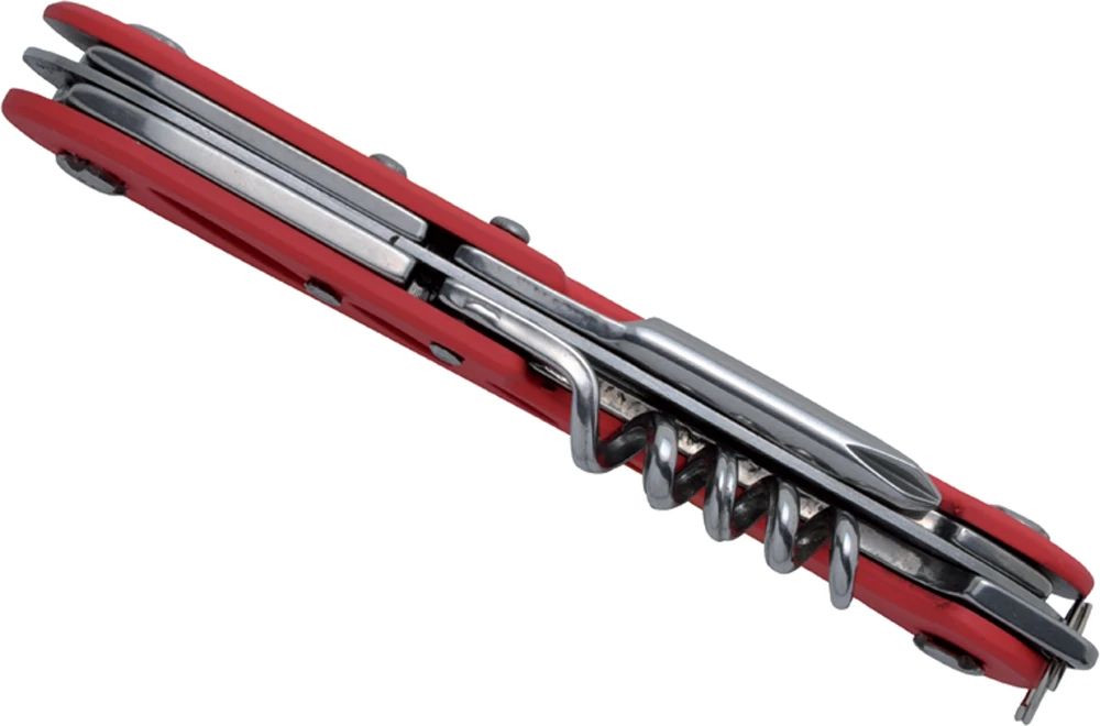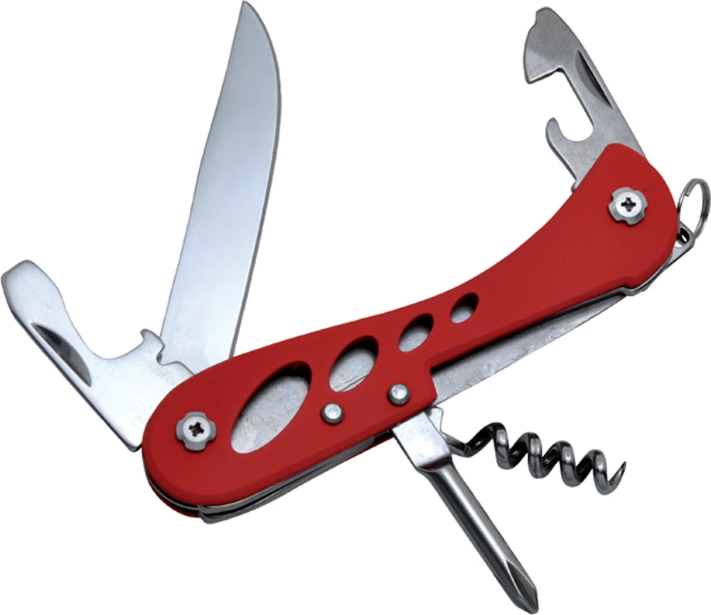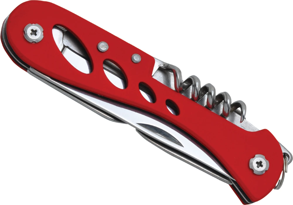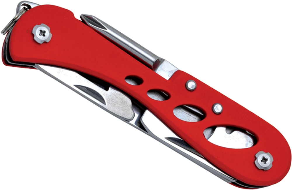 Funkce nože: nůž 7cm, otvírák lahví, otvírák konzerv, 5mm a 2 mm plochý šroubovák, vývrtka, kroužek.