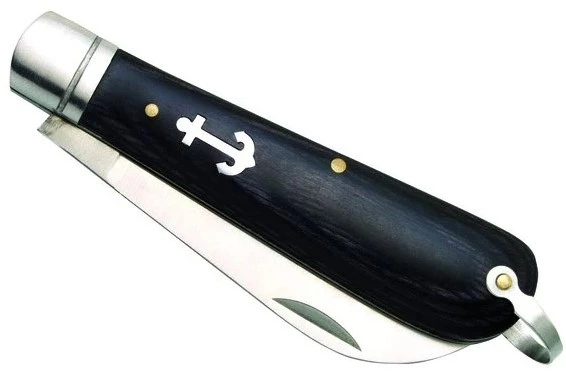 Baladeo ECO061 Breizh: zavírací nůž s čepelí z nerezové oceli a rukojetí z masivního tmavého dřeva, do kterého je vsazená ozdobná kotvička.
