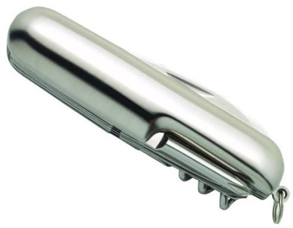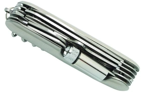 Přehled funkcí: nůž, otvírák na láhve, otvírák na konzervy, plochý šroubovák, křížový šroubovák, vývrtka, nástroje na manikůru, děrovací trn, nůžky, vodící otvor, LED světlo (včetně čtyř baterií), kroužek pro možnost zavěšení,