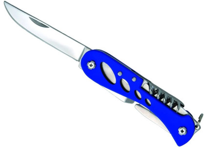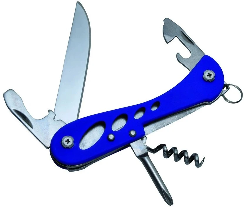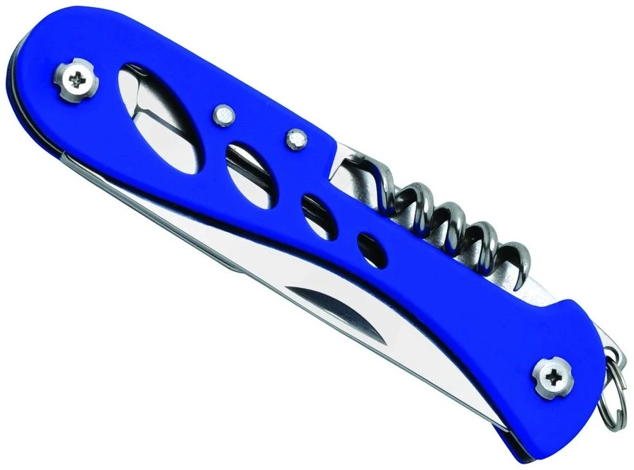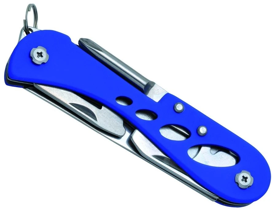 Přehled funkcí: nůž, otvírák na lahve, otvírák na konzervy, plochý šroubovák 5 mm, plochý šroubovák 2 mm, vývrtka, kroužek na klíče