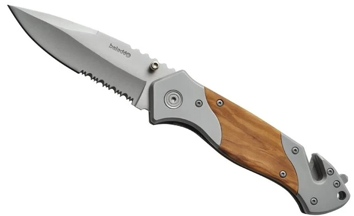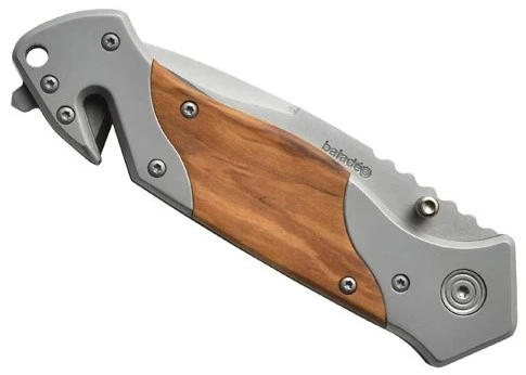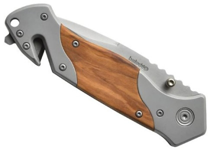 Baladéo ECO200 Rescue: zavírací nůž s jemnou čepelí z nerezové oceli pro přesné řezání. Čepel má kombinované ostří. Rukojeť je příjemná, je vyrobená z olivového dřeva. Na konci rukojeti řezačka pásů a kladívko na rozbíjení oken. Nůž se hodí na každodenní používání, využijete ho i v nouzových situacích.