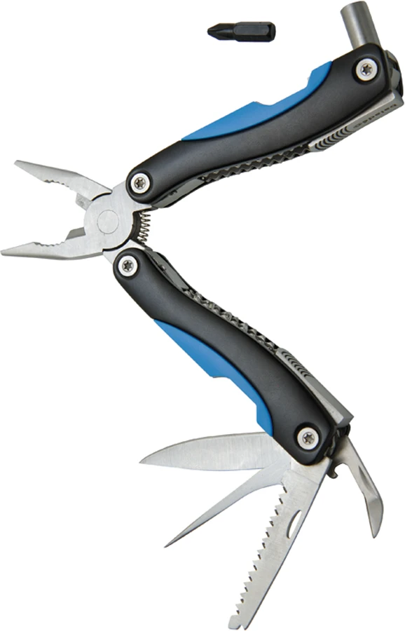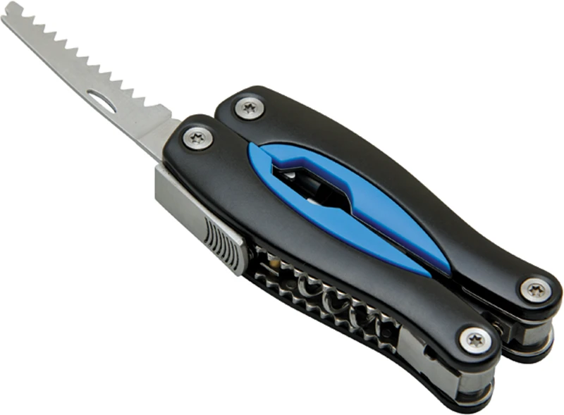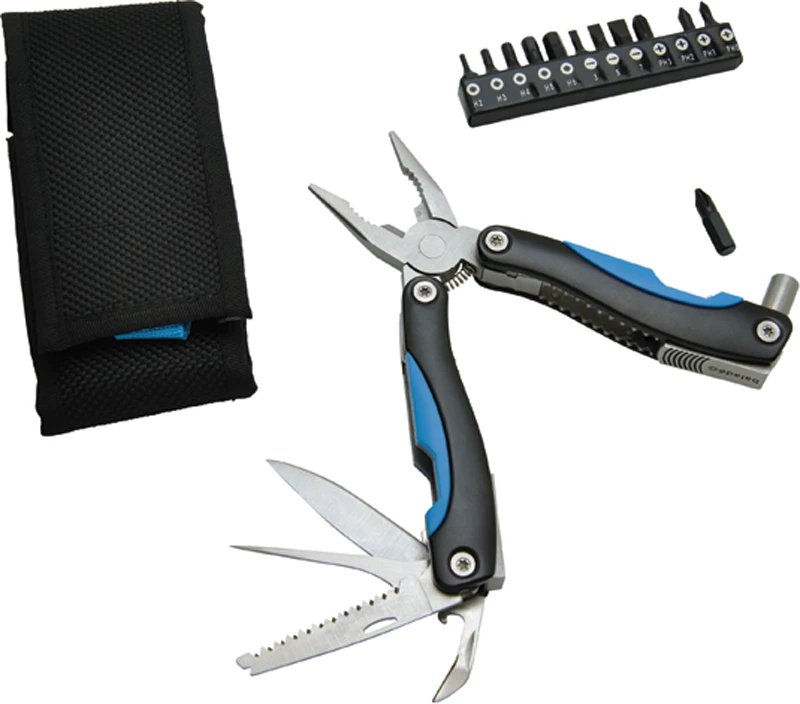 Funkce: univerzální kleště, stříhací kleště, nůž, otvírák lahví, děrovací trn, pilka, vývrtka, zaváděcí trn pro nitě, 3 velikosti imbusového klíče, 3 ploché šroubováky, 3 křížové šroubováky