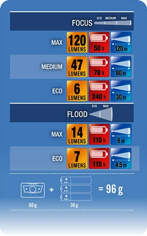 Svítivost: max/medium/eco 120/47/6 lumenů