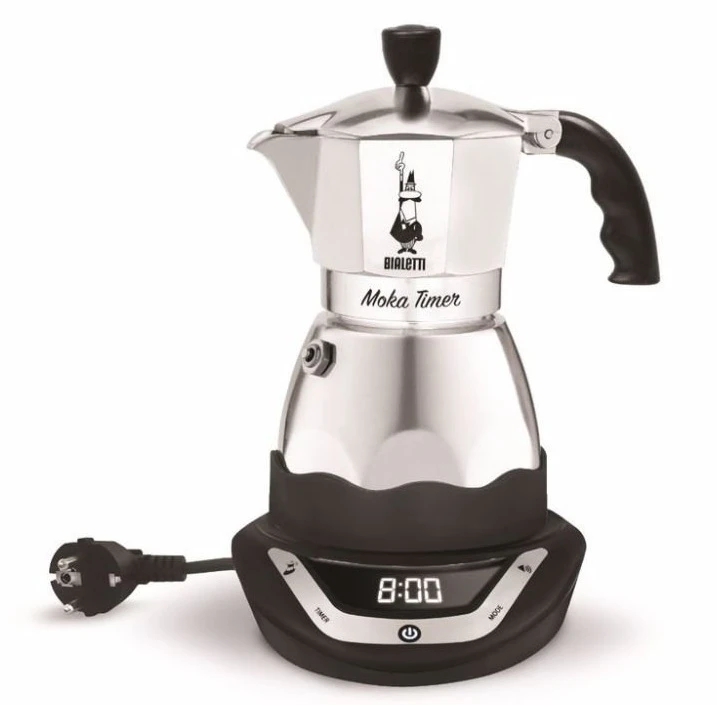 Bialetti New Moka Timer: Elektrické moka konvička od Italské firmy Bialetti. Součástí konvičky je elektrická plotýnka na které se káva připravuje, takže nepotřebujete žádný další vařič. Tato moka konvička je vhodná na domácí používání, do kempu, nebo na chatu, kde nemáte žádný vařič, ale pouze zásuvku na elektriku. Moka konvička je vyrobena z lesklého tradičního hliníku. Není určena pro mytí v myčce nádobí.