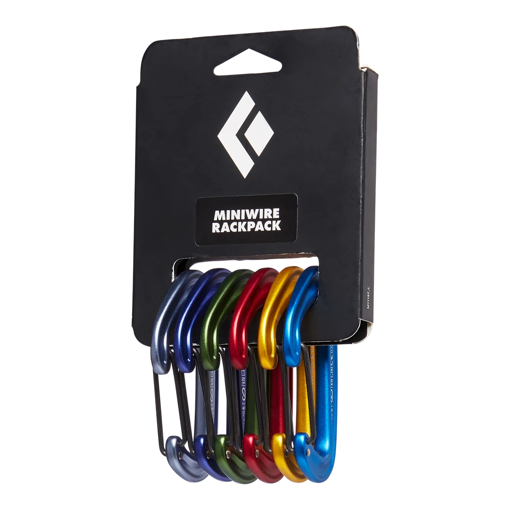 Black Diamond Miniwire Rackpack: je set malých pomocných karabin, které jsou barevně odlišené. Využijete je jako pomocné karabiny nebo na jistící prostředky jako jsou friendy nebo vklíněnce.