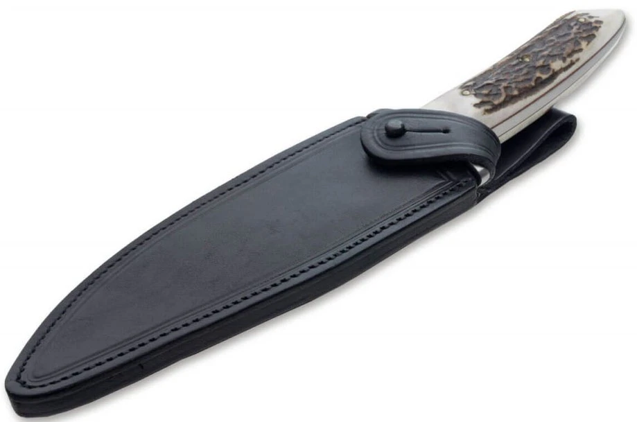 Střenky jsou z parohu jelena. Robustní záštita ruky je vyrobena z broušené nerezové oceli.