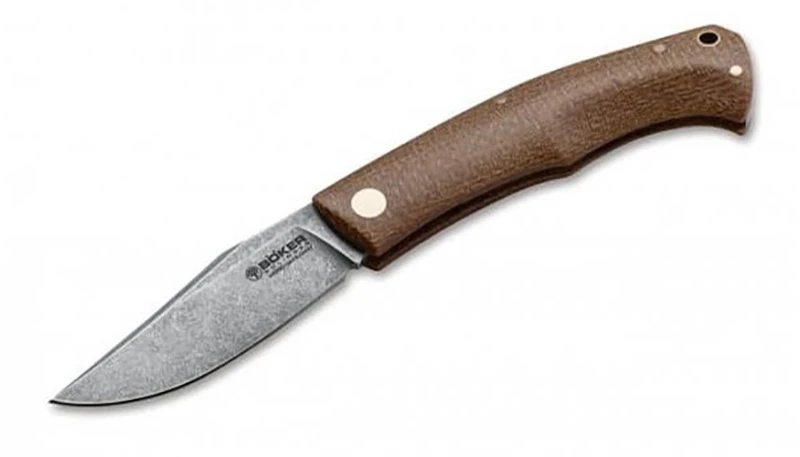 Boker Boxer EDC Brown: lehký zavírací nůž vhodný pro každodenní použití. Čepel dlouhá 7,8 cm má kamennou povrchovou úpravou a je vyrobena z oceli M390. Pojistka slipjoint se silnou pružinou zajistí čepel na místě.