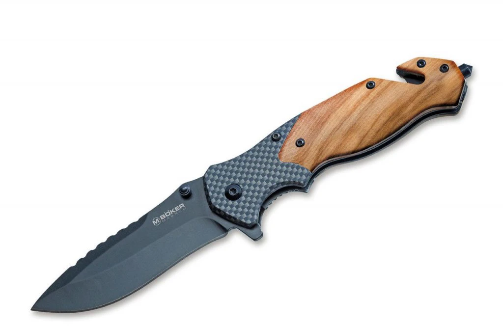 Boker Magnum Blomkvist Olive – víceúčelový kapesní nůž s třemi funkcemi - Titanem potažená čepel z nerezové oceli 440A, rozbíječ skla a řezač pásu. Zajímavě řešená rukojeť je vyrobena ze středomořského olivového dřeva a dodává noži moderní vzhled. Čepel je zajištěna pojistkou Linerlock a otevírá se palcem. Součástí je nylonové pouzdro které lze nosit vertikálně nebo horizontálně na opasku. Klip na uchycení do kapsy.