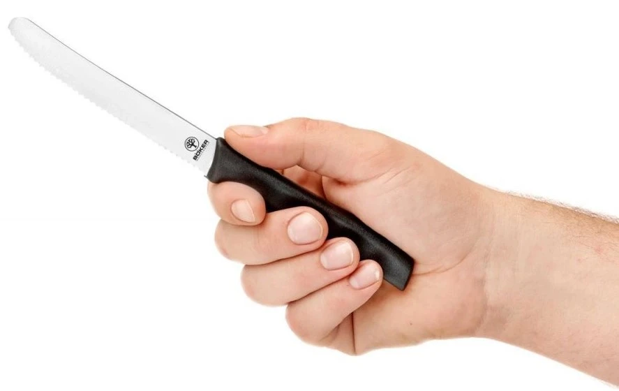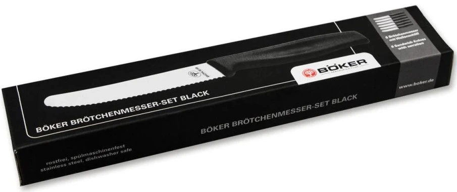 Boker Set kuchyňských nožů Sandwich 6 ks: nože mají vysoce kvalitní čepele z nerezové oceli s ostrým vlnkovaným ostřím. Hodí se pro krájení ovoce a zeleniny či pečiva. Černé syntetické rukojeti jsou ergonomicky tvarované a díky zdrsněnému povrchu vždy bezpečně padnou do ruky.