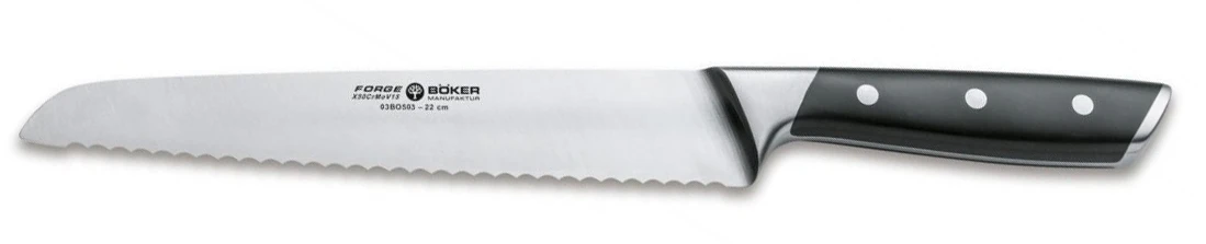 Boker Nůž na chleba Forge 22 cm: nůž s vlnkovanou čepelí na chleba a pečivo. Černé střenky ze speciálního, vysoce kvalitního syntetického materiálu ABS jsou pevně spojeny třemi nýty z nerezové oceli s kovanou částí procházející celou délkou rukojeti. Tyto nože se velmi dobře drží i při delší manipulaci.