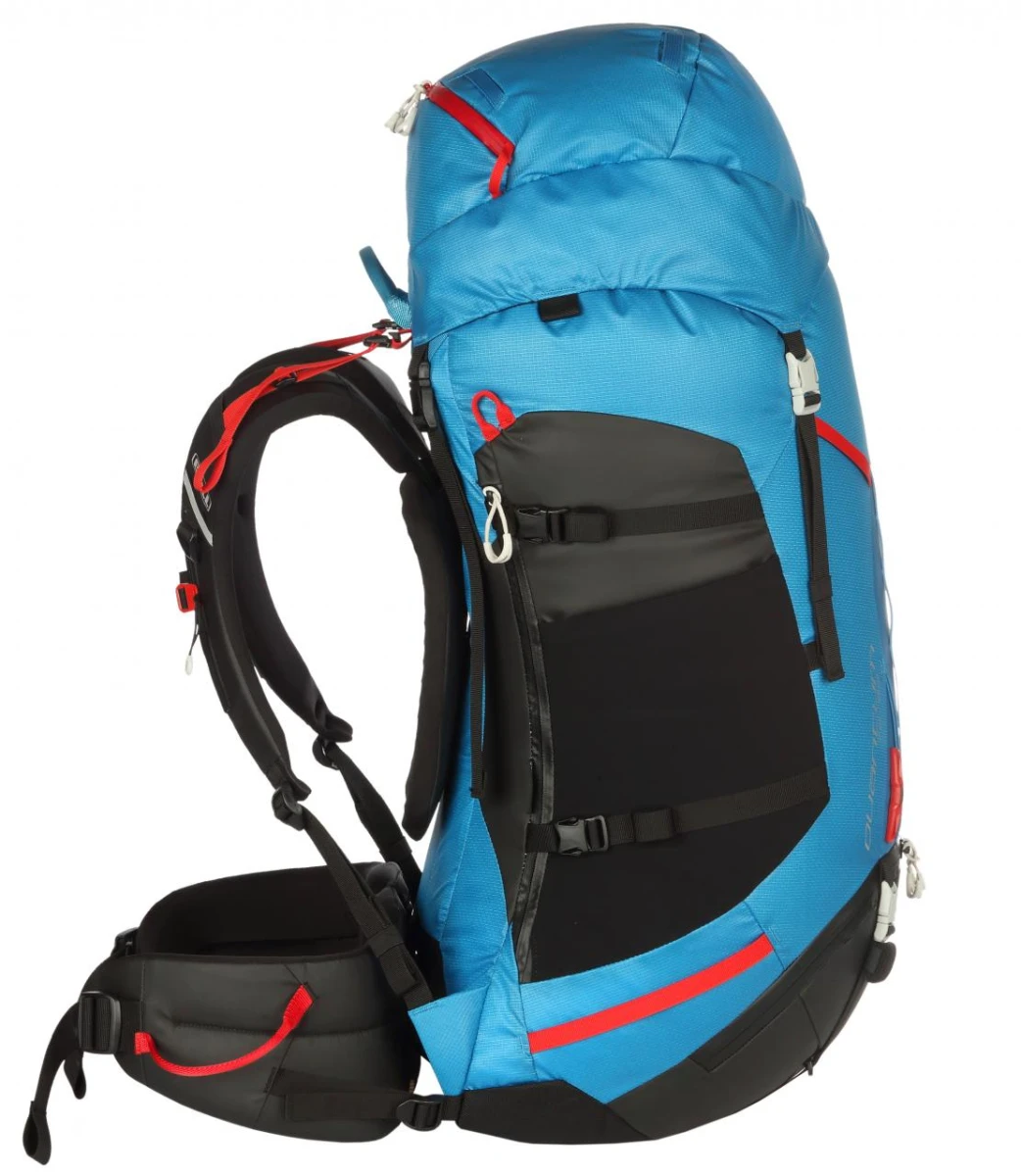 Objem je 60 litrů, ale možné rozšířit až na 80 litrů. Integrovaná pláštěnka, víko batohu se dá použít jako ledvinka.