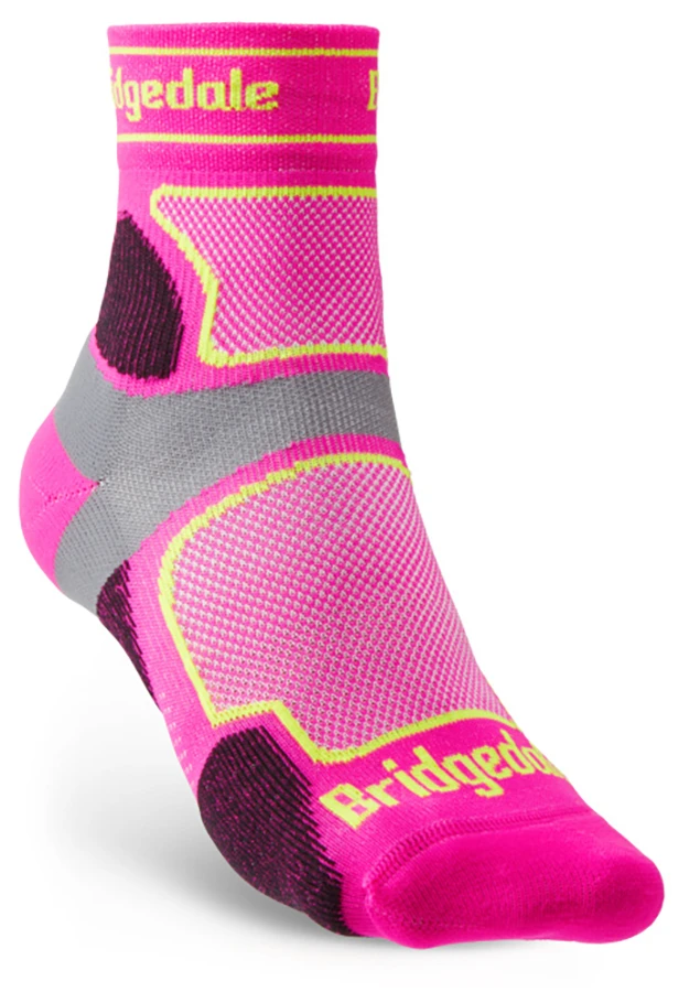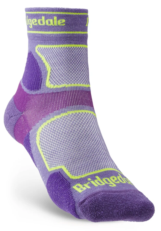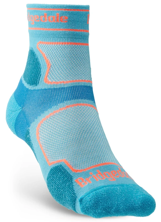 Bridgedale Trail Run Ultralight T2 Coolmax sport 3/4 Crew Women’s: středně vysoké, prodyšné ponožky vhodné na běhání. Mají polstrování a technologií T2 (smyčka uvnitř smyčky), která poskytuje zvýšenou ochranu proti tlaku. Dobře odvádí vlhkost od chodidla, to zůstane suché po celý den. Ponožky jsou vhodné do velmi teplého počasí.