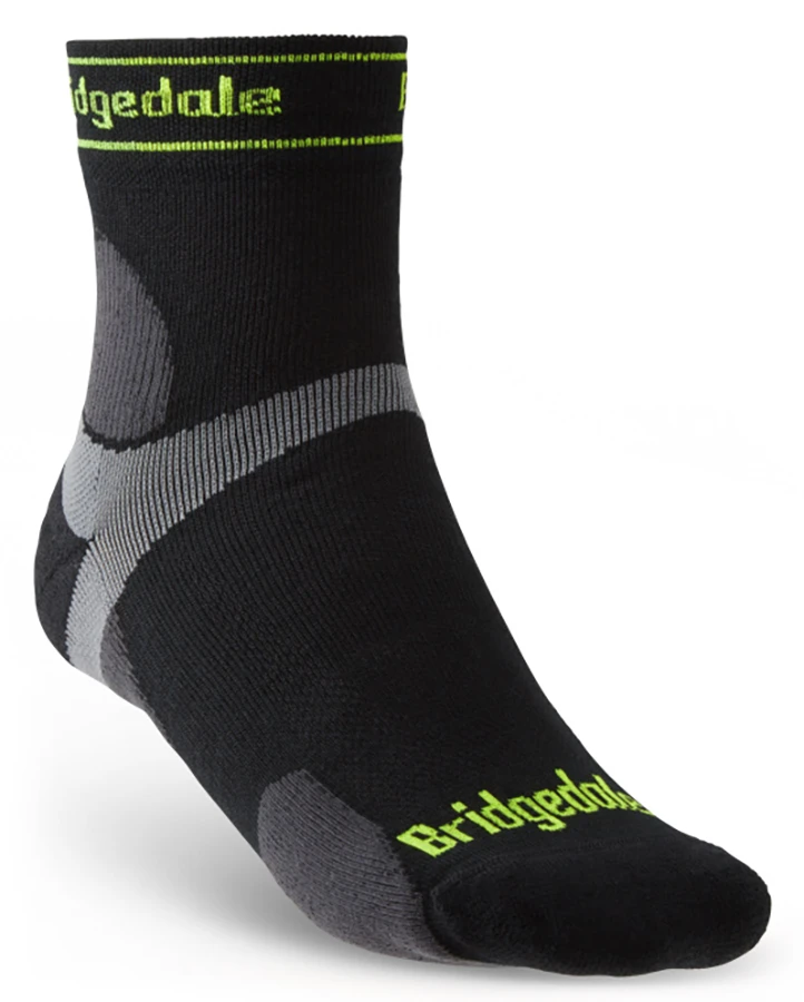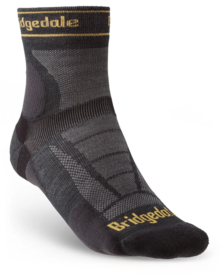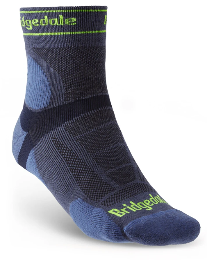 Bridgedale Trail Run UltraLight T2 Merino Sport 3/4 crew: lehké, těsné a prodyšné. Síťovina umožňuje cirkulaci vzduchu a polstrování pod patou a v oblasti prstů zajistí ochranu při došlapu. Velmi dobře odvádí vlhkost od chodidla, proto jsou vhodné na mnoho sportovních aktivit: běh, jízdu na kole, turistiku a další. Gramáž do teplého počasí.