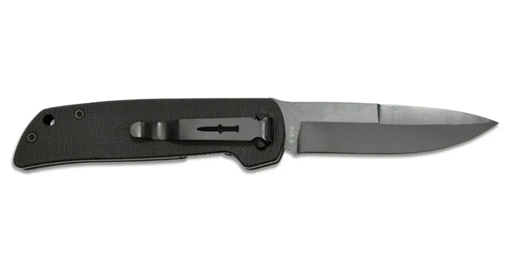 Jeho čepel ve tvaru drop point je vyrobena z oceli AUS-8A, která je zabarvena černou matnou barvou.