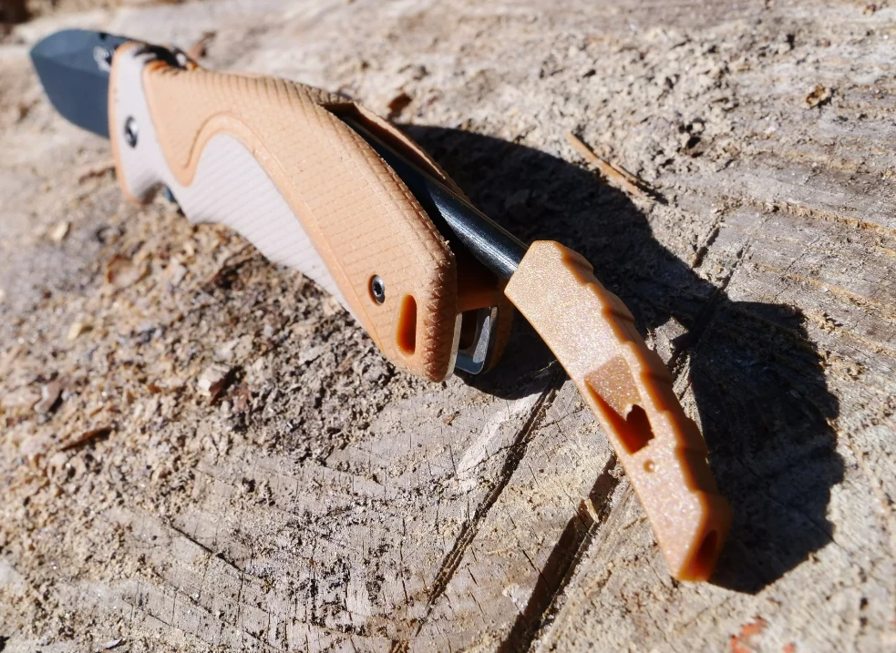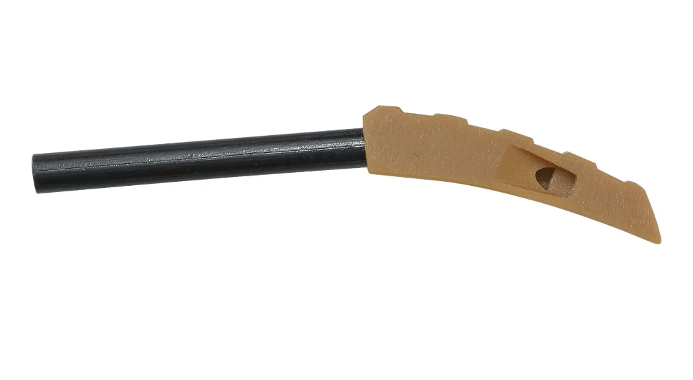 Dodává se s píšťalkou a Firestarter integrovaným v rukojeti.