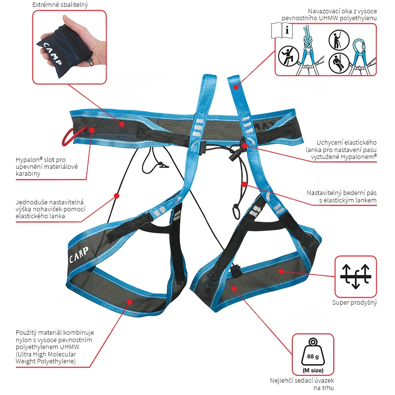 Camp Alp race - je extrémně lehký skialpinistický úvazek s váhou těžko uvěřitelných 68 g. Je určený primárně pro závodní skialpinismus, ale využijete ho i na ferraty. Vše je směřováno k nízké hmotnosti (68 g). Dalším bonusem je dobrá sbalitelnost.