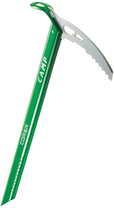 Camp Corsa – o skutečně velice dobré váze 202 g. Tento turistický cepín je určený pro skialpinismus, turistiku. Je vyrobený ze slitiny hliníku a to včetně hrotu. Proto se nehodí tam, kde přijde často do kontaktu s kameny. Hodí se jako opora při postupu, pro jištění v obtížných úsecích i pro brždění v případě pádu.