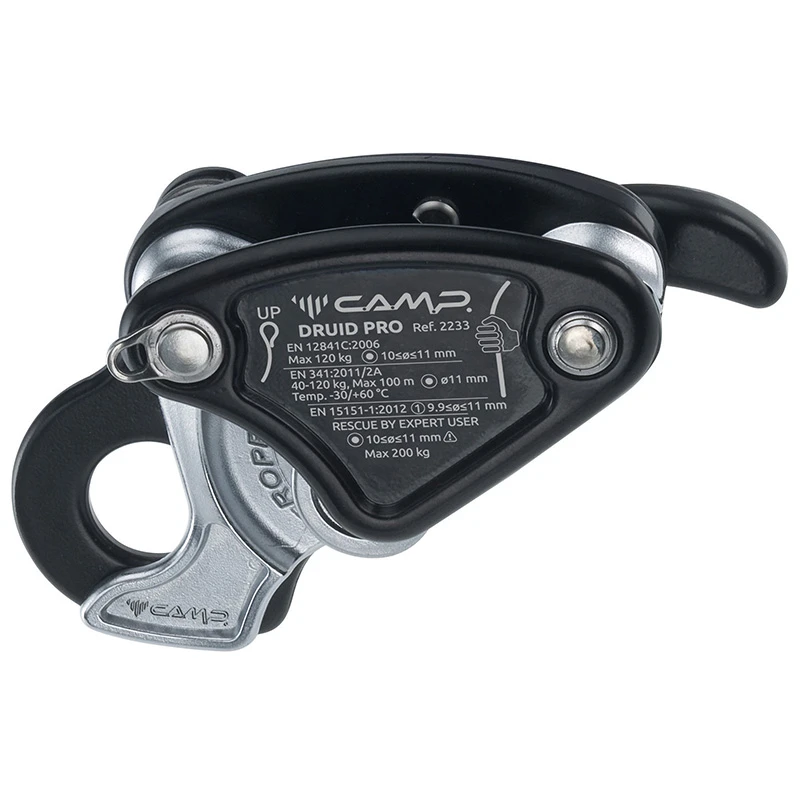 Camp Druid Pro : precizně zpracovaná brzda pro slaňování a šplhání po pracovním laně při práci ve výškách. Dá se použít i při polohování. Samozřejmě má certifikát pro práci ve výškách.