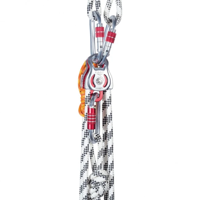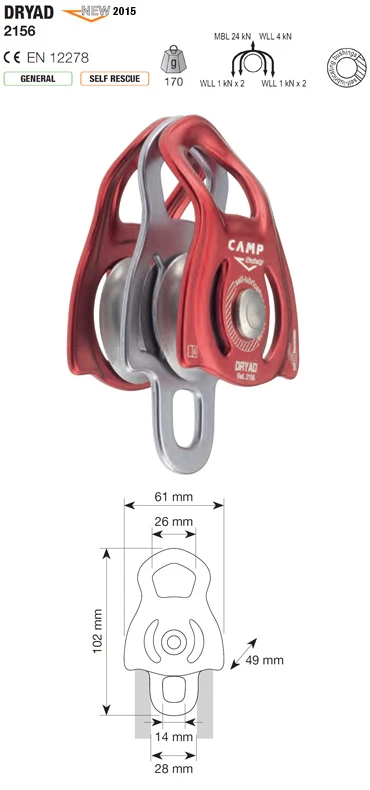 Camp Dryad : dvojitá kladka pro vytvoření kladkostrojů, pro pracovní využití. Kluzné ložisko, pohyblivé bočnice. Dolní připojovací bod.
