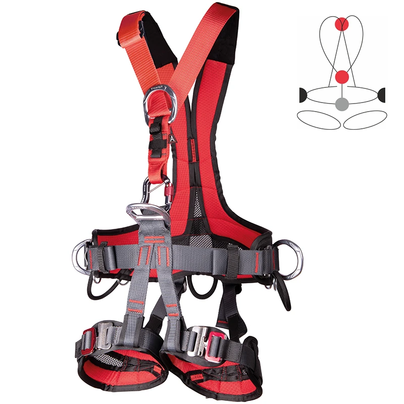 Ergonomické polstrování skvěle obepíná záda i ramena a s dodatečnou prodyšnou síťovinou zaručuje potřebnou ventilaci. Navazovací oko sedacího úvazku nabízí jedno oko pro připojení hrudního úvazku a druhé hliníkové ve tvaru D pro připojení lanyardu nebo hardwaru pro lanový přístup. Postroj nabízí 5 upevňovacích bodů z hliníkové slitiny: 1 hrudní, 1 zádový pro zachycení, 1 centrální a 2 boční pro polohování.