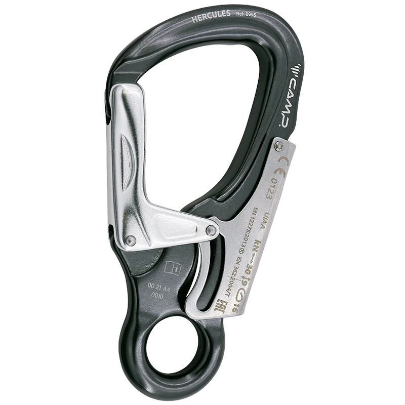 Spojka Camp Hercules – duralová karabina s automatickou, dlaňovou pojistkou. Dají se použít po spojení s lanyardem pro zajištění nebo pro polohování.