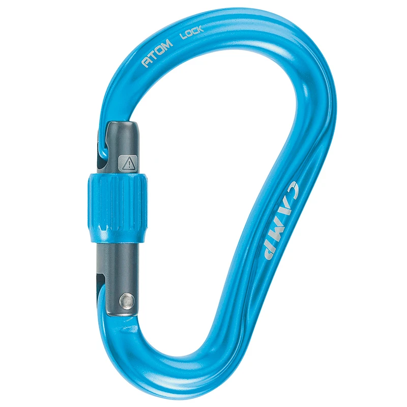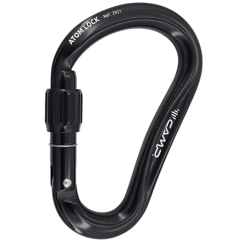 Camp Atom Lock : je klasická HMS šroubovací karabina. Pojistka zámku karabiny je šroubovací. Dostatečná světlost. Tvar umožňuje jištění polovičním lodním uzlem v případě nouze.
