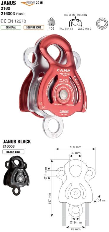 Camp Janus : kluzné ložisko, duralová rolna. Pohyblivé bočnice, kluzné ložisko, množství připojovacích bodů. Dolní připojovací bod. Rozměrná dvojitá kladka s velkými rolnami je ideální pro vytvoření kladkostrojů, pro pracovní využití.