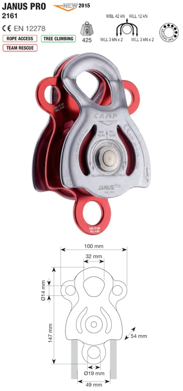 Camp Janus Pro : kuličkové ložisko, množství připojovacích bodů, duralová rolna. Dolní připojovací bod. Pohyblivé bočnice. Dvojitá kladka s velkými rolnami je zajímavá pro vytváření kladkostrojů.