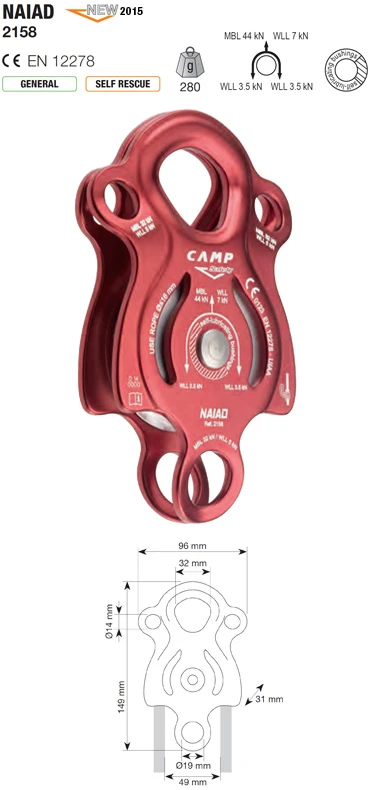Camp Naiad: kladka do kladkostrojů. Vyznačuje se velkou rolnou a na kluzné ložisko vysokou účinností. Možnost připojení a 3 karabin do hlavního připojovacího body a dvou do sekundárních bodů. Navíc spodní připojovací bod.
