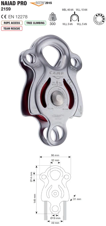 Camp Naiad Pro: kladka do kladkostrojů. Vyznačuje se velkou rolnou a na kluzné ložisko vysokou účinností. Možnost připojení a 3 karabin do hlavního připojovacího body a dvou do sekundárních bodů. Navíc spodní připojovací bod.