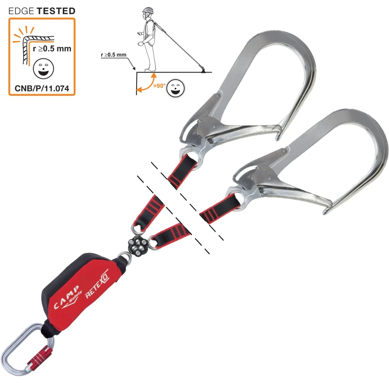 Má pružný lanyard do Y. Pružnost je výhodná pro použití na postroji, kdy má jen 115 cm a nevadí vám při postupu. Po natažení má 155 cm. Součástí jsou spojky s automatickou pojistkou a světlostí 110 mm (příhradové konstrukce).