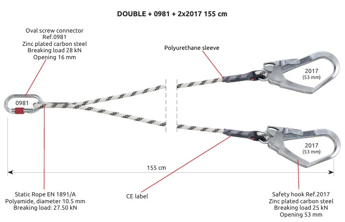Camp. Rope Lanyard Double 155 cm + 0981 + 2x2017 - je Y lanyard se dvěma spojkami s dlaňovou pojistkou (světlost 53 mm). Je určený pro polohování nebo kotvení při výškových pracích. Je vyrobený ze statického lana o průměru 10,5 mm.