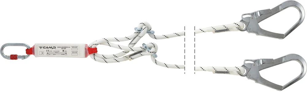 Camp. Shock Absorber Rope Adjustable Double 145-200 cm + 0981 + 2x2017 - délkově nastavitelný pracovní tlumič pádů s dvěma rameny určený pro výškové práce s dvěma spojkami o světlosti 53 mm. Pracuje na principu párajícího se švu spolu s lanyardem z 12,5 mm statického lana.