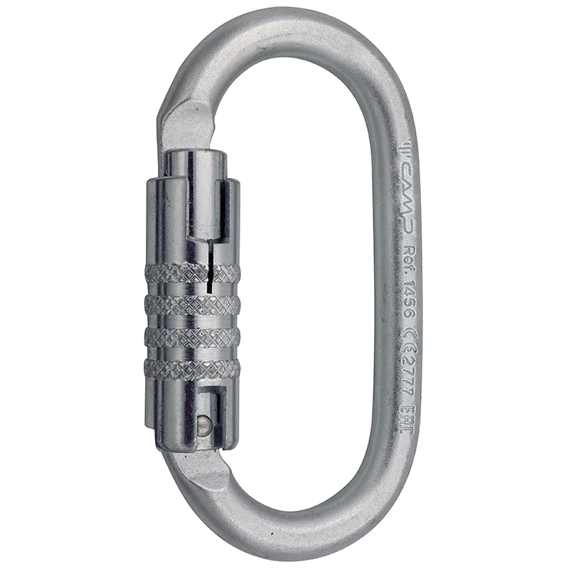 Camp. Steel Oval Pro 3Lock : vysoce pevná a velmi odolná ocelová karabina s automatickou triple lockovou (třípolohovou) pojistkou. Má certifikát pro práci ve výškách EN 362 a EN 12275.