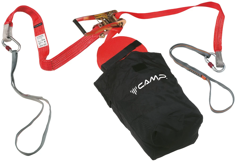CAMP. Temporary Life line 5-18 m: je mobilní kotvící systém, který slouží pro zajištění až dvou osob při práci ve výšce. Ukotví se například na střeše na dvou místech, pomocí ráčny se vypne a na popruhu se pohybovat až dvě pracující osoby.