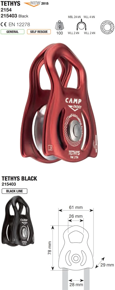 Camp Tethys: kladka pro arboristiku, výškové práce i záchranáře. Je vhodná pro vytahování těžkých břemen a použití nylonových statických i dynamických lan.