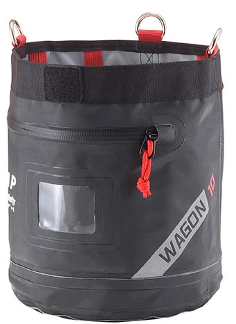 Tři pevná kovová oka slouží pro zavěšení nebo připojení k pracovnímu postroji. Tužší materiál Camp Wagon umožňuje nechat vak otevřený během používání.