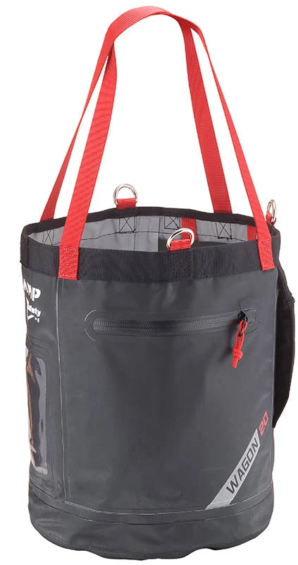 Tři pevná kovová oka slouží pro zavěšení nebo připojení k pracovnímu postroji. Tužší materiál Camp Wagon umožňuje nechat vak otevřený během používání.