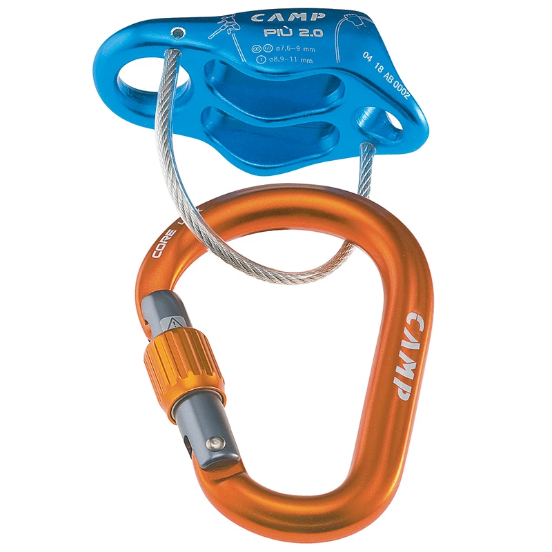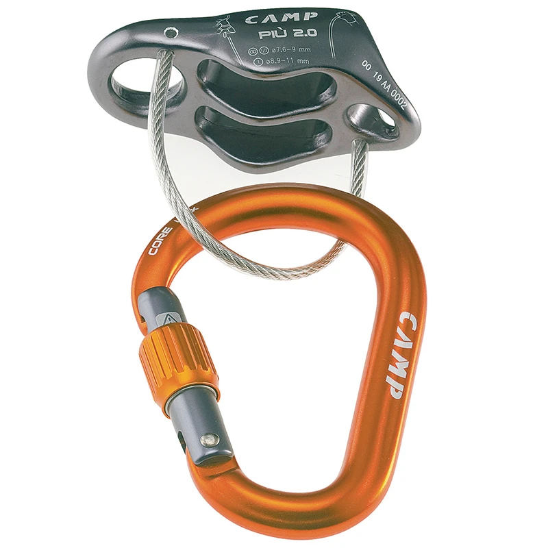 Camp Piu 2.0 Belay Kit – jistící set, který obsahuje jistící kýbl pro jednoduchá i dvojitá lana a karabinu s pojistkou. Výhodou kýblu je, že nekroutí lana jako osma a má dobré brzdné síly.