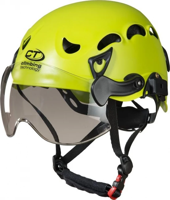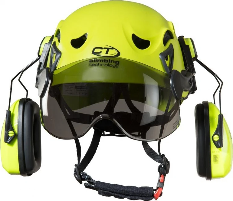 Arboristická přilba Climbing Technology X-Arbor : skořepinová helma má uvnitř polystyrenovou pěnu. Vnitřní polstrování z absorbční textílie, které je možné vyprat. Pásek pod bradou odolává větší síle než 50 daN. Jdou na ni upevnit sluchátka Peltor a ochranný štít Climbing Technology Visor.