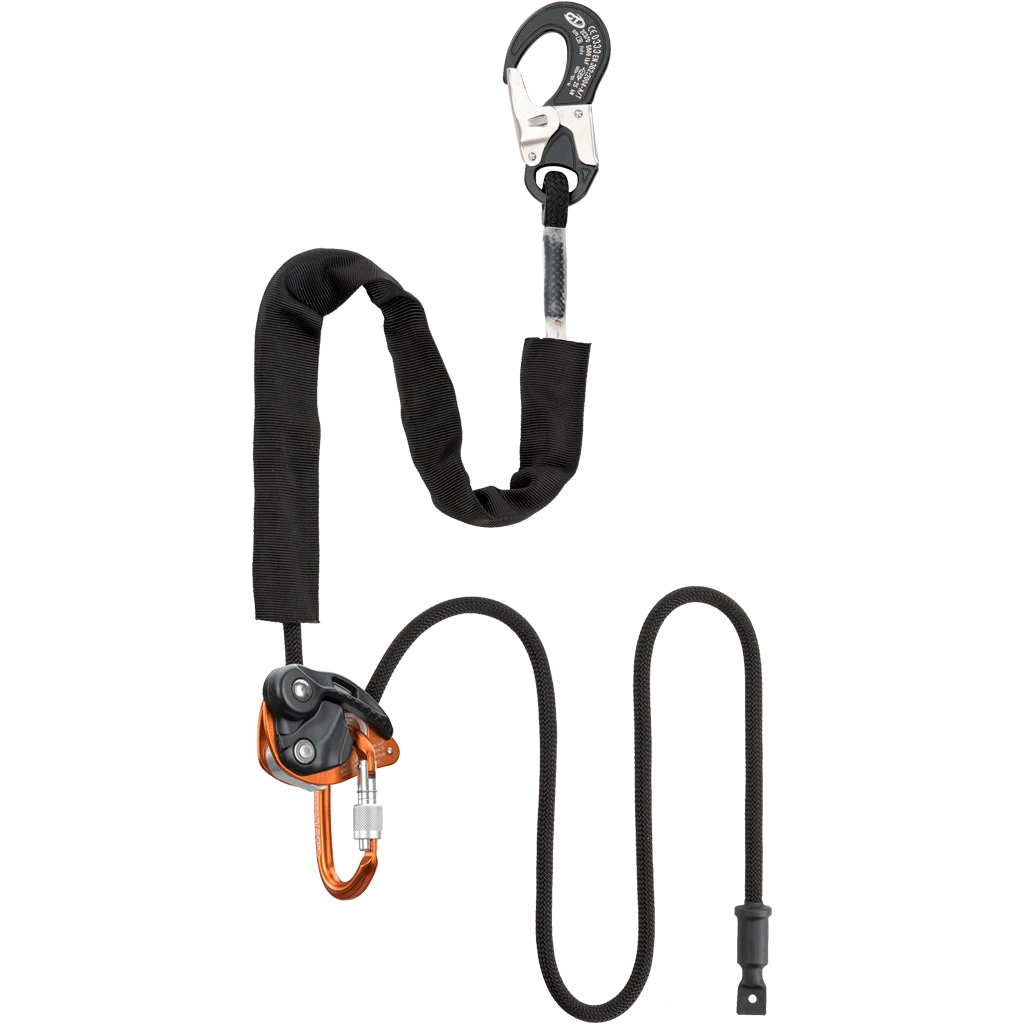 Je na něm chránička lana. Na polyamidovém lanyardu je připojen Climbing Technology Finch. Je spolehlivý, pohodlně se s ním manipuluje. Slouží pro polohování, využijete jej na konstrukcích, sloupech, v energetice atd.