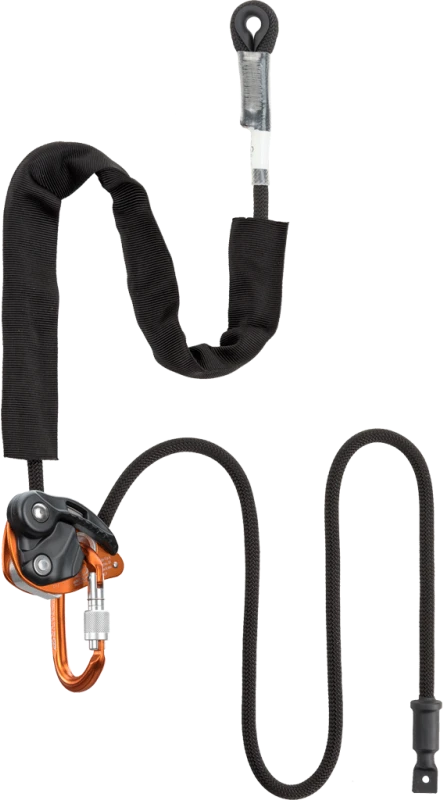 Je na něm chránička lana. Na polyamidovém lanyardu je připojen Climbing Technology Finch. Je spolehlivý, pohodlně se s ním manipuluje. Slouží pro polohování, využijete jej na konstrukcích, sloupech, v energetice atd.