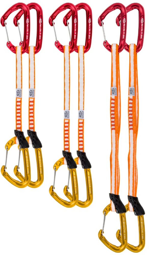 Climbing Technology Fly-weight EVO Set Dyneema: sada ultralehkých expresek s drátěným zámkem vhodná pro vícedélkové sportovní i tradiční lezení. Na spodní karabině je gumový Fixit, který zabrání aby se smyčka během používání nepohybovala a neotáčela.