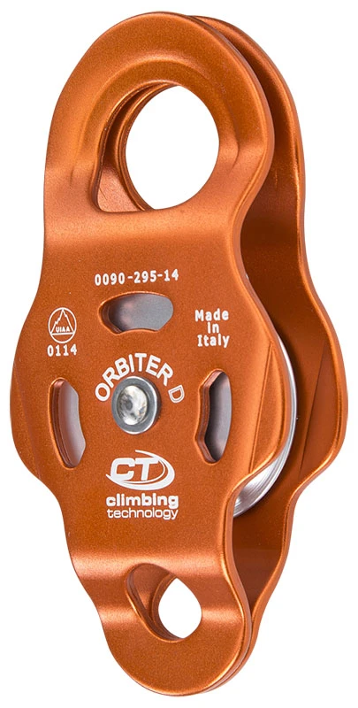 Climbing Technology Orbiter D: s odklopnými bočnicemi, spodním připojovacím bodem. Výhodou této kladky je kuličkové ložisko a výborná účinnost (96%) z toho vyplývající.
